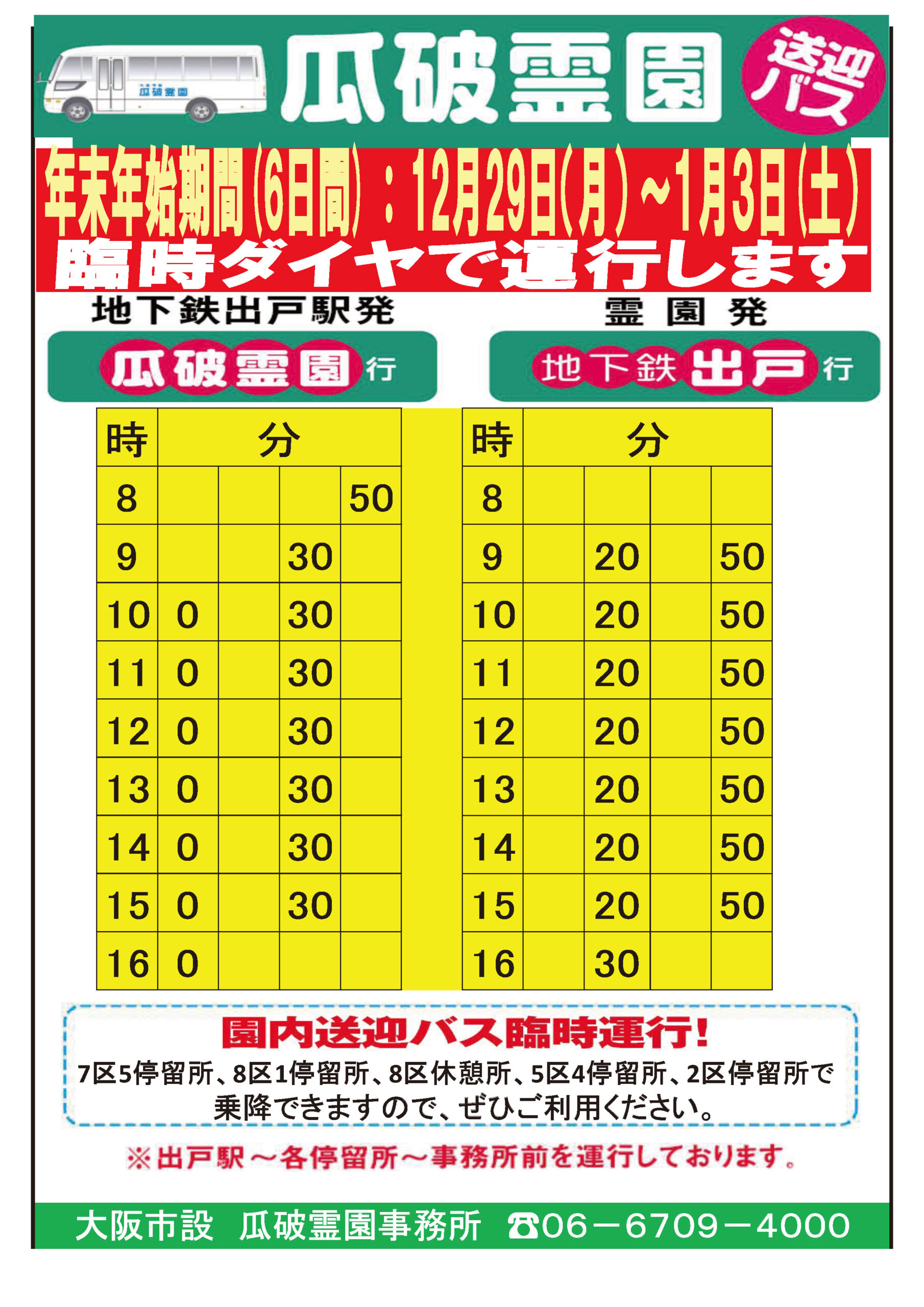 1)瓜破霊園 12月29~1月3日は、終日30分間隔にて増便運行します。